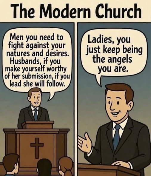 Now, the flip side of the meme, whatever you do, women cannot be called out. Women aren’t to be corrected. They cannot be. Women are the better half of the relationship. If wives are sinning, it’s the husband’s fault. Men can do no right and women can do no wrong. When the servant leadership isn’t working and no response is following, or worse, contempt fills the response, and that contempt and rejection cannot be touched with a 10-foot pole, what does that leave a man with?